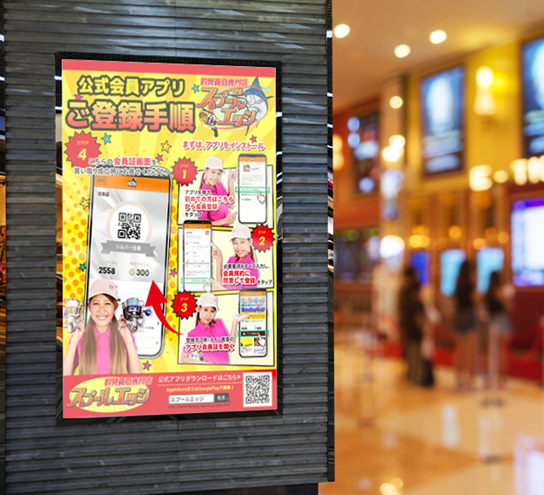 ターゲットを「アプリ登録に不慣れな来店顧客」と想定し、一目で内容が伝わるようカラフルで視認性の高いデザインとしました。